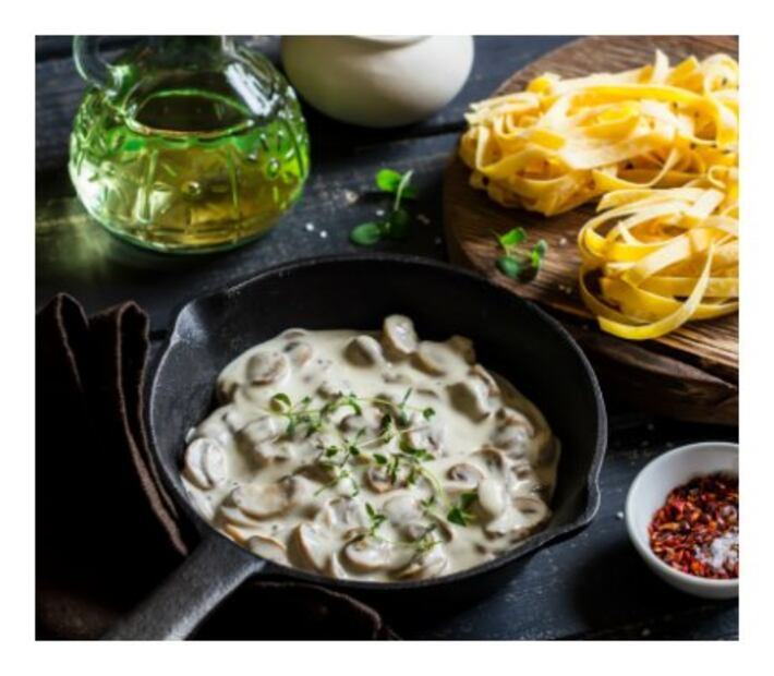 Finalmente, incorpora las láminas de champiñón, sazona a tu gusto y déjalos cocer hasta que se evapore el agua y los ingredientes estén ligeramente dorados. Agrega el caldo de pollo, mezcla bien y raspa el fondo del sartén; deja reducir durante tres minutos. Luego, agrega la crema para batir e integra bien. Deja reducir durante tres minutos más. Si la salsa aún no está lo suficientemente espesa, agrega una cucharada de harina para espesar. Cuece durante dos minutos más. Integra el queso parmesano y la pasta fettuccine. Mezcla bien.