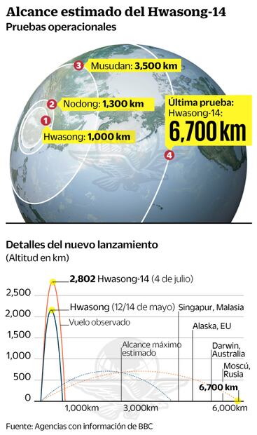 Según medios locales, se probó un misil llamado Hwasong-14, que alcanzó una altura máxima de 2 mil 802 kilómetros y recorrió 933 kilómetros en 39 minutos. Esta nueva prueba supone un gran avance en su programa armamentístico ya que, según los cálculos, el misil sería capaz de impactar en costas de Alaska.
