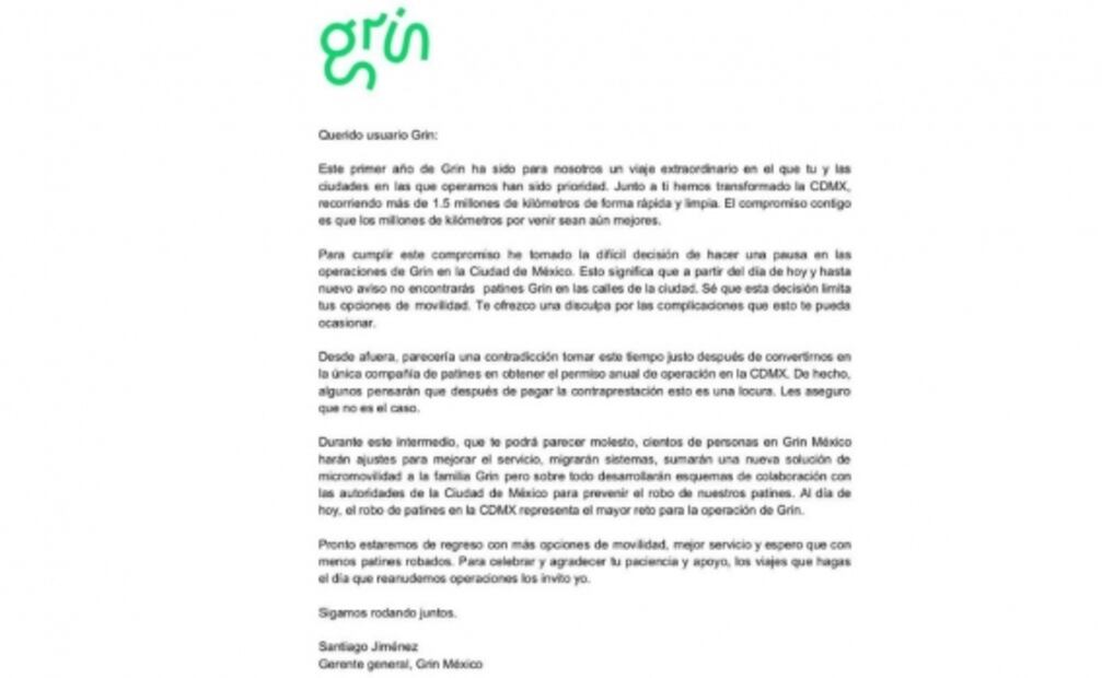 , director general de Grin en México, señaló que en esta pausa se pensarán en opciones de movilidad que mejoren la experiencia de los capitalinos pero, a partir de hoy, no habrá patines en las calles de la ciudad.