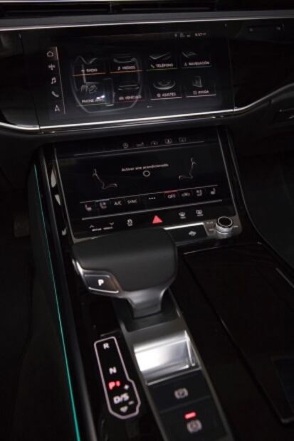Todavía ni si quiera dábamos marcha y el vehículo no dejaba de sorprender con su equipamiento. Ya sea en el tablero, en la consola central o en el techo, el nuevo Audi A8 está lleno de botones digitales táctiles que sustituyen a los tradiconales, lo que da un toque mayor de elegancia y limpieza a los acabados del auto. Además, en la parte trasera, cuenta con una pequeña pantalla, que controla sistemas como el aire acondicionado o el de navegación, que se desprende como si fuera una tableta e incluye una función para que también sea un celular.