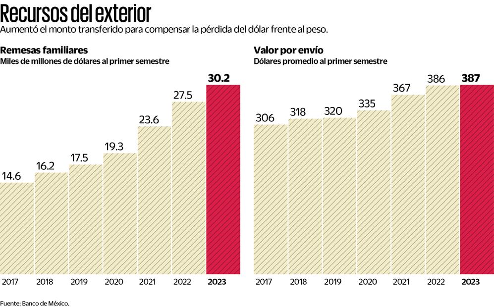 Por su parte, Banco Base destacó que en junio se acumulan ocho meses consecutivos en los que se observa una caída anual de las remesas reales medidas en pesos mexicanos. Eso se refleja en el poder adquisitivo, afectado por la apreciación del peso acumulada de 13.90% entre junio de 2022 e igual mes del presente año, con el ingrediente de una inflación de 5.06%.
