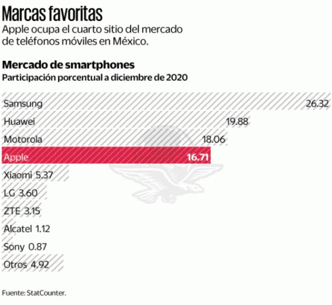Apple ha tenido altibajos en el mercado mexicano durante los últimos cinco años, pues cerró 2016 con 17.2% de participación, en noviembre de 2018 tuvo un repunte a 19.6%, pero en octubre de 2019 descendió a 11.9% y cerró el año pasado con 16.7% de participación, de acuerdo con datos de StatCounter.