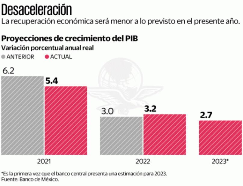 La autoridad bajó de 6.2% a 5.4% su proyección para este año, la subió de 3.2% a 3.0% para 2022 y estableció una expectativa de 2.7% para 2023.