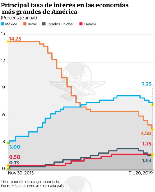 Esto significa que durante 2019 mantuvo una restricción monetaria, pues sólo en cuatro ocasiones redujo la tasa en 25 puntos base cada una, con lo cual acumuló un punto porcentual de baja, al pasar de un nivel de 8.25% en el que se encontraba a inicios de año, para terminar en 7.25%.