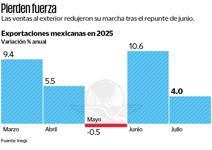 Las exportaciones totales de mercancías reportaron un aumento anual de 4.0% el mes pasado, luego de incrementarse 10.6% en junio.