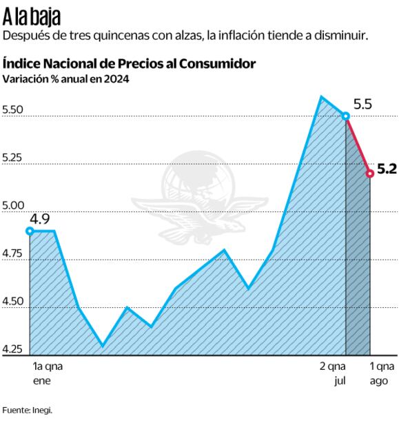La inflación en México llegó a 5.16% a tasa anual en la primera mitad de agosto, ligando así dos quincenas a la baja, debido sobre todo a la moderación parcial en los precios de los productos agropecuarios, después de que se vieran bajo presión en meses previos.
