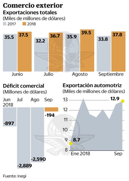 La información oportuna de comercio exterior de septiembre de 2018 indica un déficit comercial de 194 millones de dólares, saldo muy inferior al déficit de mil 934 millones de dólares observado en el mismo mes de 2017. Con ese resultado, en los primeros nueve meses del año la balanza comercial presentó un déficit de 10 mil 223 millones de dólares.