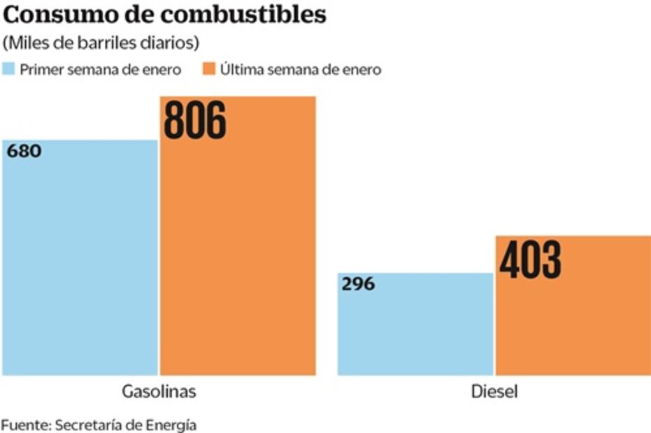 La información de la Subsecretaría de Hidrocarburos, de la Unidad de Políticas de Transformación Industrial y la Dirección General de Petrolíferos mostró que la venta de gasolinas en la primera semana de enero fue de 680 mil barriles diarios y para la última semana subió a 806 mil, es decir, un alza de 18.5%.
