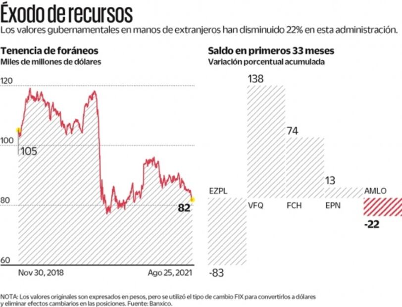 Mientras al 30 de noviembre de 2018 la deuda del gobierno en manos de inversionistas extranjeros alcanzó 105 mil millones de dólares, para finales de agosto de este año totalizó 82 mil millones, lo que significa una salida de 22% o 23 mil millones en los primeros 33 meses de la presidencia de Andrés Manuel López Obrador.