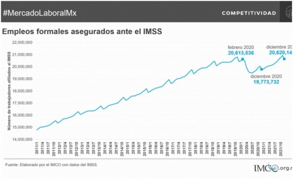 De acuerdo con el IMCO , en diciembre del 2021 el registro de trabajadores ascendió a 20.6 millones de personas, lo que significó una reducción mensual de casi 313 mil puestos, equivalente a una tasa de (-)1.5%. Típicamente, el último mes de cada año suelen observarse caídas en el número de registros, debido principalmente a la baja cantidad de contrataciones; es decir, mientras que el nivel de separaciones observadas debido a renuncias, despidos y jubilaciones mantiene un nivel similar al observado en los otros meses del año, el número de contrataciones disminuye en el último mes. Sin embargo, aunque en diciembre de 2021 se observó una caída en el número de puestos asegurados ante el IMSS, esta reducción fue de menor magnitud, y fue la segunda caída menos pronunciada desde 2016.