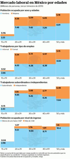 Tomando en cuenta a los trabajadores subordinados e independientes, más los que reportaron no tener ingreso (que realizan trabajo familiar), el número de personas que supera las cinco décadas y que perciben menos de uno hasta tres salarios mínimos sumaron 10.4 millones, 86.9% del total.
