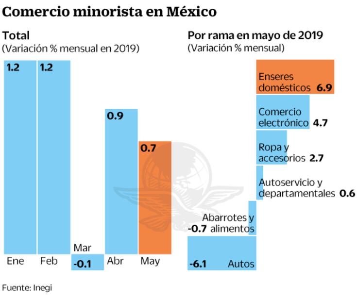 La Encuesta Mensual sobre Empresas Comerciales aplicada por el Inegi mostró que el comercio minorista en México se incrementó 0.7% en mayo con relación a abril del presente año, el segundo mes consecutivo de crecimiento.