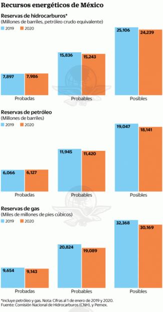 Al 1 de enero de este año, el país dispone de un potencial total de reservas de 24 mil 239 millones de barriles de petróleo crudo equivalente (MMMbpce), incluidas las clasificadas como probadas, probables y posibles. Sin embargo, al 1 de enero de 2019, el órgano regulador reportaba un nivel de 25 mil 106 millones de MMMbpce.