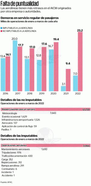 “Ahí también puede haber demora, porque tardan en llegar a puertas de embarque y desembarque o en salir, y esto genera que los aviones sean detenidos en tierra en el AICM”, detalló.