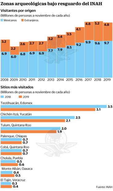 Cifras del Instituto Nacional de Antropología e Historia (INAH) muestran que los 194 sitios arqueológicos bajo su resguardo recibieron a 14 millones 524 mil visitantes entre enero y noviembre del año pasado, la menor cantidad desde 2016.