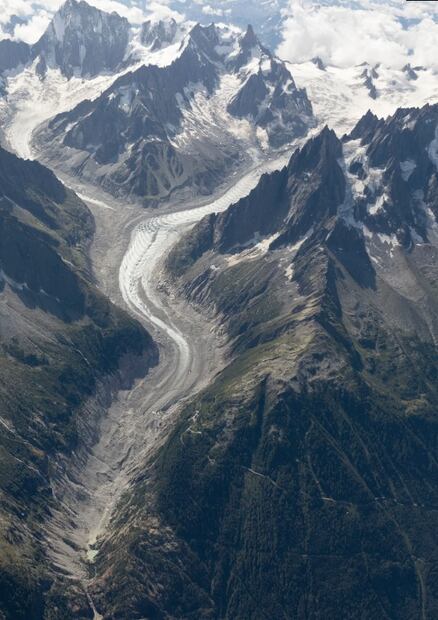Una comparativa de fotografías aéreas tomadas con un intervalo de cien años han puesto de manifiesto el deshielo a gran escala al que están sometidos los glaciares del Mont Blanc , techo de los Alpes.