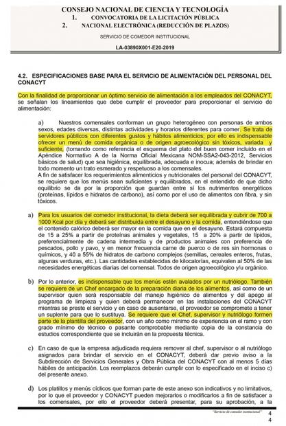 En la sede de Conacyt no ingieren cualquier refrigerio, en los términos de referencia del contrato, que se pude consultar públicamente, se exige al proveedor que los platillos deben de realizarse exclusivamente con “ productos orgánicos y/o campesinos agroecológicos sin tóxicos , de alta calidad y ser adquiridos por productores agrícolas de la región”, se lee en el documento. Además, aclara que, como sus “ servidores públicos tienen diferentes gustos y hábitos alimenticios ; por ello es indispensable ofrecer un menú […] variado y suficiente, que sea higiénico, equilibrado e inocuo”.