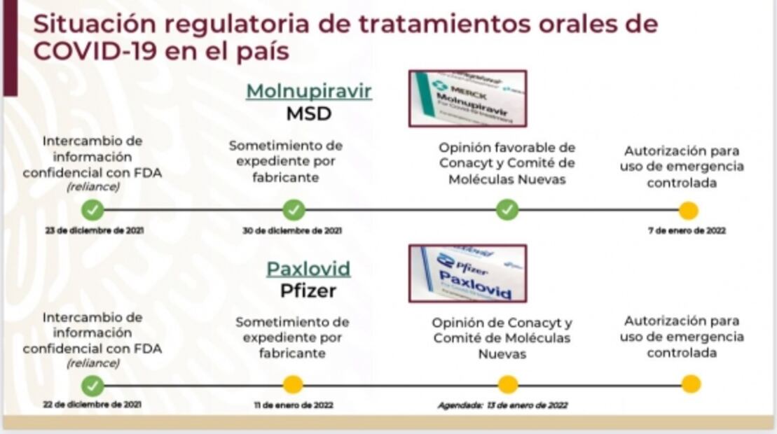 En la mañanera de hoy viernes, 7 de enero, el presidente Andrés Manuel López Obrador anunció que la Comisión Federal para la Protección contra Riesgos Sanitarios (Cofeprís) está en vías de aprobar el uso de las dos pastillas creados por las farmacétuicas Merck y Pfizer.