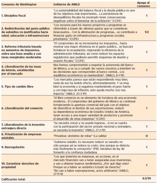 En el cuadro puede apreciarse que la política económica anunciada recibe una calificación de congruencia con el consenso de Washington de 8.5 sobre 10 puntos posibles.