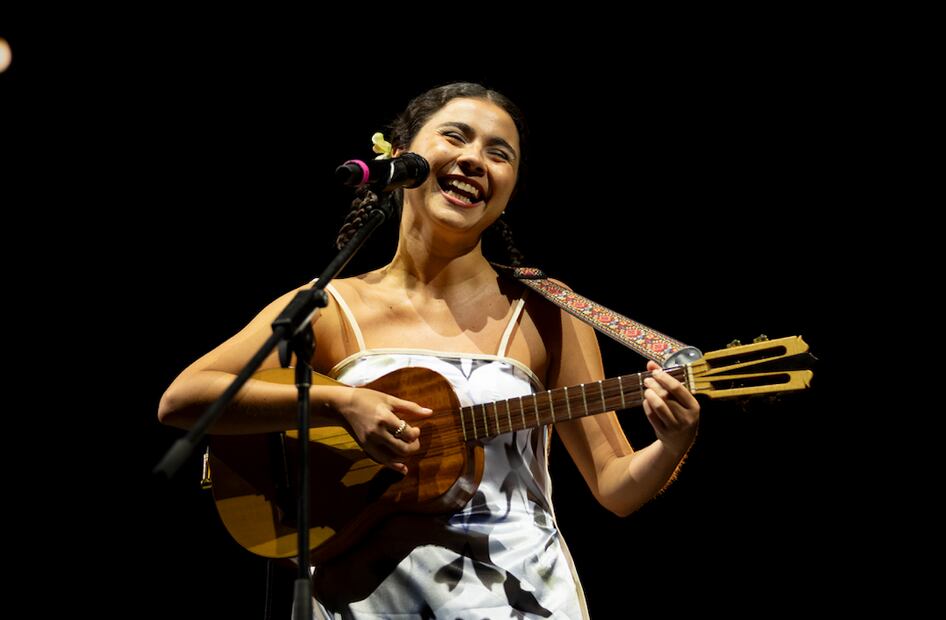 Y es que, antes de la deslumbrante clausura de la banda británica de post-rock- indie- progresivo Black Country New Road, hicieron aparición en el escenario casi exclusivamente artistas con una propuesta sonora centrada en la guitarra y la voz (y, en el caso de Silvana Estrada, en el cuatro venezolano y la voz). Este formato —representativo de la trova y, más recientemente, de lo que pasó a ser conocido como la canción de autor— fue acudido, por ejemplo, por Rosas, proyecto abridor del festival que, frente un público todavía no muy numeroso (pero muy atento y con la mejor energía, eso sí) aprovechó para cantar algunas de sus canciones clásicas en guitarra y voz pero, también, para presentar otras en un formato full-band, nunca antes por él experimentado (una curiosidad es que en su banda toca la batería Mariela, la vocalista trip-hopera de Sueño a Marte).