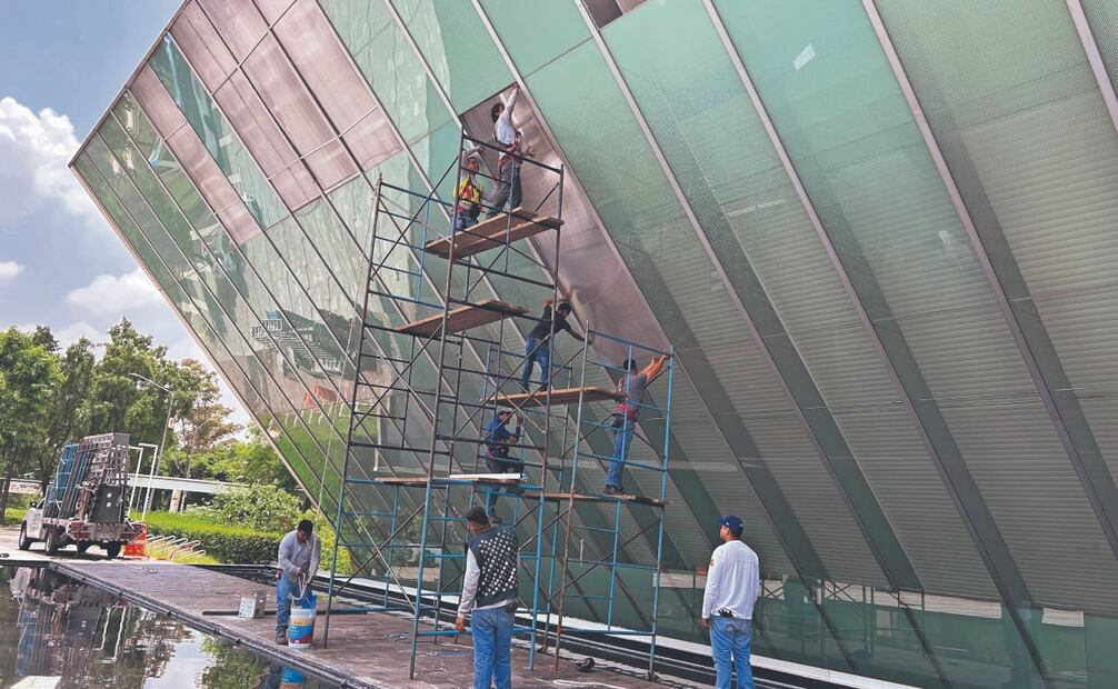 Un grupo de trabajadores coloca un andamio, a la altura de los huecos donde estuvieron los ventanales; al mediodía alcanzan las zonas dañadas. Dos hombres (uno con uniforme militar) borran las pintas de la entrada, “UNAM facha”, por ejemplo; un par de horas después, uno de los símbolos pasó del color rojo a un tono deslavado en los trabajos de limpieza. En la fuente hay pedazos de varilla, con los que muy seguramente quebraron la fachada; también hay una lata de aerosol junto a los mensajes de las pintas: “Fuera gringos, no lleguen a San Andrés Mixquic”, “No más indiferencia”.