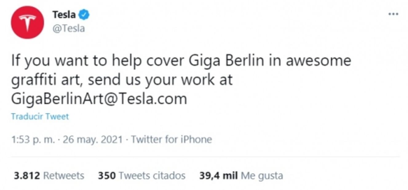 “Si quieres ayudar a cubrir los muros de Giga Berlin con increíble arte grafiti manda tu trabajo a GigaBerlinArt@Tesla.com”.