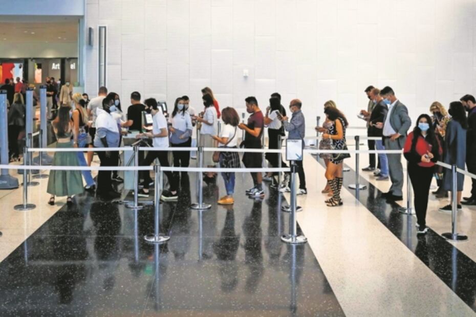 Aunque se cancelaron los cocteles y fiestas, como medida preventiva por la pandemia, ello no fue impedimento para que los compradores y compradoras se quitaran el tapabocas y bebieran champán en el centro del recinto, con vista a los cuatro puntos cardinales de la feria, donde los pasillos, conforme pasan los minutos y los días, se van llenando.