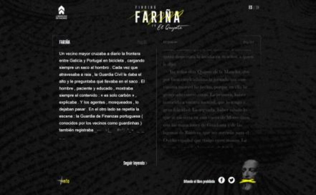 En la página uno puede leer Fariña a partir de palabras del clásico de Miguel de Cervantes . A través de esta opción de lectura los editores manifiestan su inconformidad por los límites que se han puesto a la obra de Carretero.