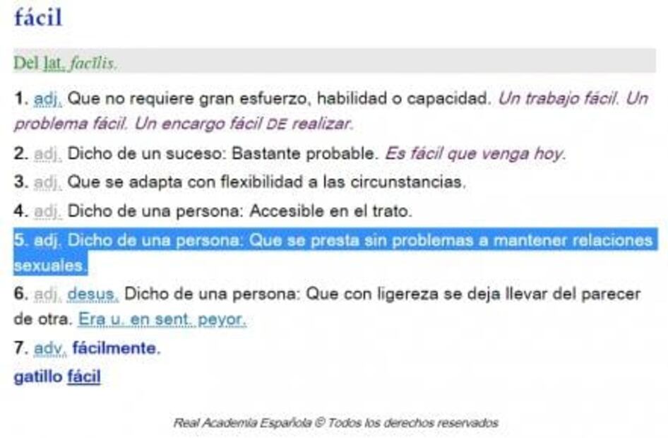 La Real Academia Española (RAE) ha modificado la quinta acepción del adjetivo "fácil" , para que no se refiera a una "mujer" que "se presta sin problemas a mantener relaciones sexuales" sino a una "persona".