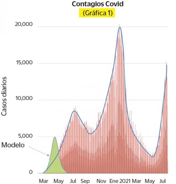 No hay mejor ejemplo de la ineptitud con la que se ha manejado la epidemia en México que estas curvas. Viendo el tamaño de lo que la Secretaría de Salud esperaba en mayo de 2020, comparado con lo que realmente ha sucedido, podemos comprender los estragos provocados por minimizar durante mucho tiempo el uso de pruebas, por haber afirmado repetidamente que las mascarillas no protegen y por la falta de preocupación por los decesos que venían (ya que el primer modelo de López-Gatell calculaba solo 6000 fallecimientos, en total). Pero, sobre todo: ningún país basó su gestión de la epidemia en un modelo tan simplista y risueño, tejido más con base en intereses políticos que atendiendo a la emergencia de salud que comenzaba.