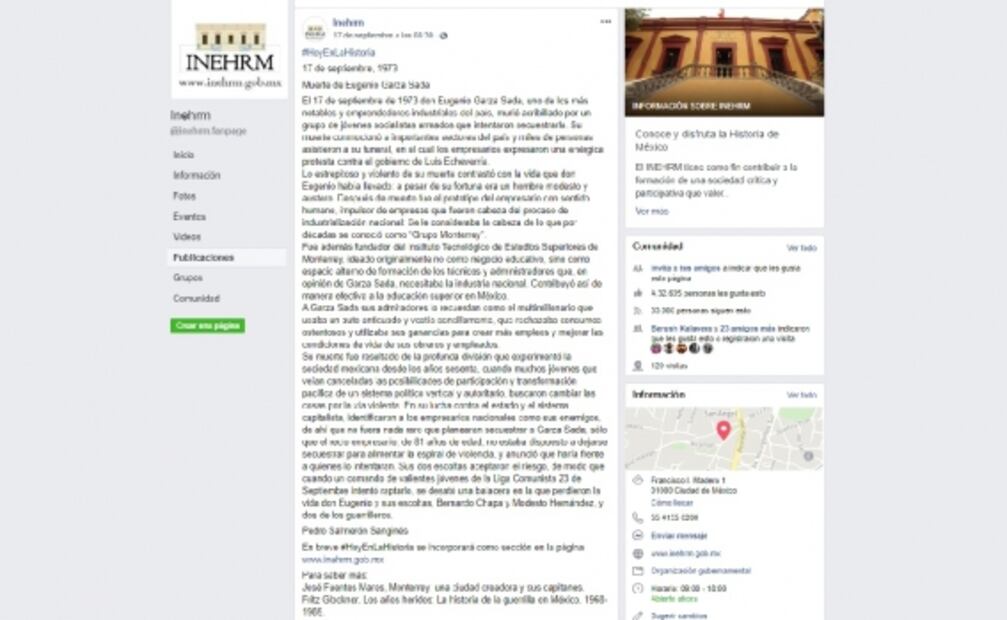 El martes pasado, el historiador Pedro Salmerón difundió a través de la cuenta oficial de Facebook del INERHM la publicación “17 de septiembre, 1973. Muerte de Eugenio Garza Sada”.