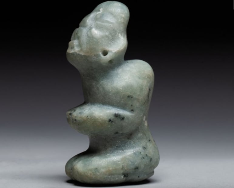 Una tercera pieza es el lote 129, una pequeña estatua antropomorfa que está arrodillada, con una joroba y un rostro que mira hacia el cielo “con intensidad”, que fue tallada en jadeita verde, que mide 7,3 x 3,1 x 4 cm y que habría sido elaborada por la cultura Olmeca. Se prevé que sea vendida entre los mil y los mil 500 euros (23 mil 300 y 34 mil 900 pesos).