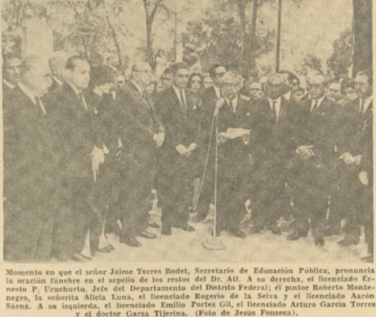 Los restos mortales del famoso pintor mexicano Gerardo Murillo “Dr. Atl”, fueron sepultados ayer en la Rotonda de los Hombres Ilustres del Panteón Civil durante una solemne ceremonia que presidió, con la representación del Presidente de la República el Secretario de Educación Pública, don Jaime Torres Bodet .