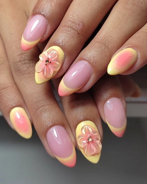 No puede faltar el detalle de la flor en 3D. Quienes aman este estilo pueden lucir sus manicuras de primavera y verano 2025 con este elemento en un diseño de uñas con tonos pastel. Este tiene los bellos colores del amanecer.