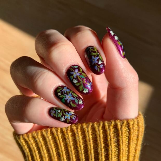 Si tú o tu manicurista tienen un talento especial para crear diseños que se asemejan a los de acuarela, no dudes en lucir una obra como esta. En esta propuesta resalta el tono púrpura con efecto cromado. Las flores se plasman como en un jardín.
