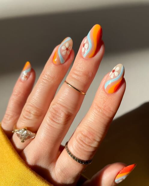 Este diseño de uñas conecta con la nostalgia de los años setenta. Su creadora las define como “groovy nails”. Lucen increíbles con la mezcla de naranjas, azules y blancos, y sus ondas en tendencia y flores.
