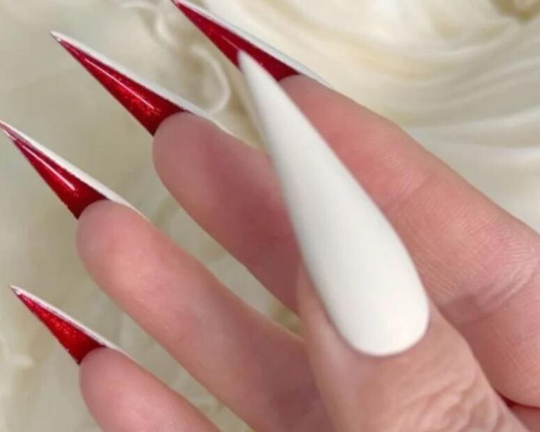 Estas uñas largas en forma stiletto combinan una superficie mate en color blanco y en la parte interna un rojo vino brillante que sólo se deja ver al mover las manos. Este tipo de manicura juega con los contrastes, no solo de color, sino también de textura. El acabado mate da sobriedad, mientras que el rojo interno añade un toque chic y sensual.