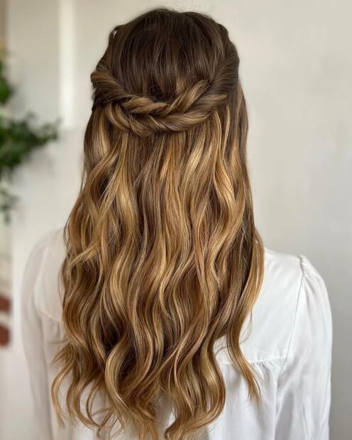 Este peinado es ideal para quienes buscan un look elegante y desenfadado, un estilo versátil que se adapta tanto a eventos formales como a un día casual. Consiste en recoger la parte superior del cabello dejando algunas ondas suaves en las puntas, lo que aporta volumen y movimiento.