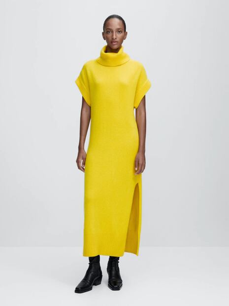 Aunque los colores como el negro y el café tienen especial protagonismo esta temporada, también algunos colores vivos ocupan un buen lugar en las tiendas y armarios. Además, justamente el color vivo es el sello distintivo del 2022. Pueden llevarse prendas en texturas abrigadoras con un toque de fucsia, verde o amarillo, como este vestido lima largo de manga corta y cuello alto, elaborado en cachemira y lana (para algo más otoñal: mostaza). Se puede combinar con mules y botas altas.