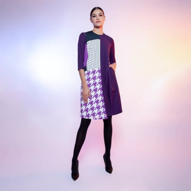 Este año, Benito Santos presentó su colorida colección 100 Geométrico. Si amas el morado, este vestido bicolor es para ti, con detalles de prints de lunares -el famoso polka dot- y patas de gallo con color.