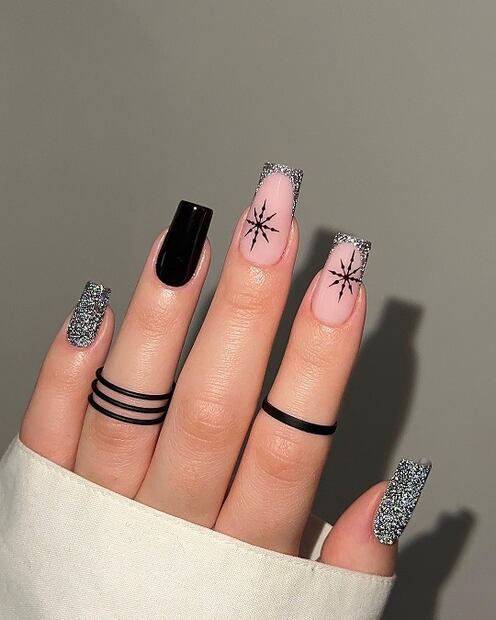 El negro es un color que se ha mantenido entre los favoritos del nail art, sin importar la temporada. Si eres amante de este tono oscuro, no dudes en jugar con él en un diseño de uñas navideño. Copos negros y glitter plata se pueden unir en un diseño de uñas diferente a los más convencionales.