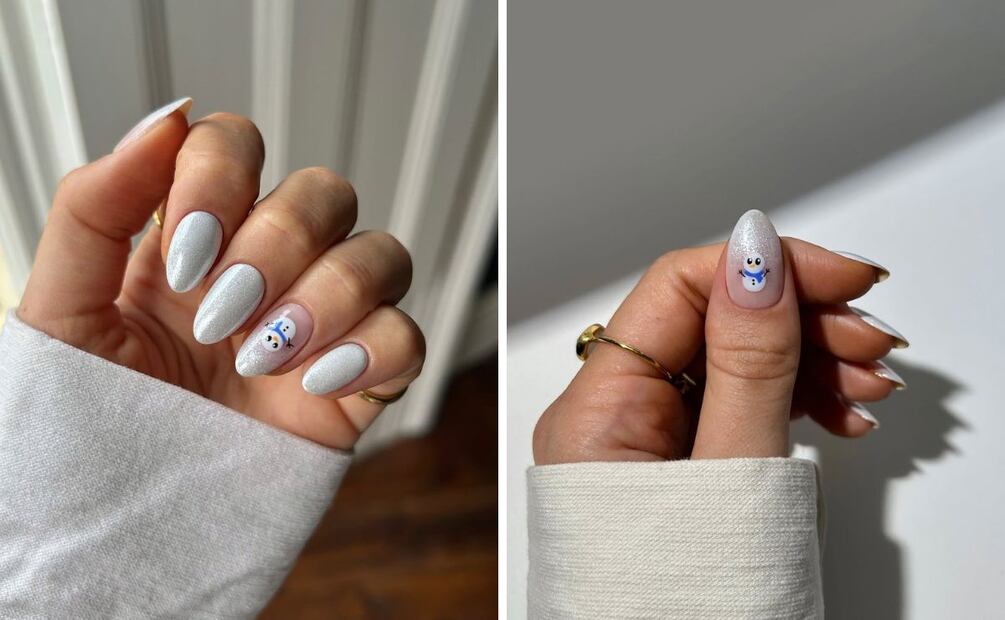 Las amantes de los tonos blanquecinos pueden lucir un diseño invernal inspirado en la nieve. Sobre una base blanca con efectos brillantes como el glaseado o el cromado, se puede pintar un muñequito de nieve, para darle a la manicura un acento navideño, festivo y divertido. Si deseas una opción aún más sencilla, sustitúyelo por copos de nieve en otro tono de blanco.