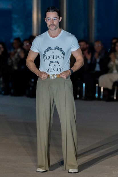 Campillo —primer mexicano que ha participado en el prestigioso concurso LVMH Prize (del grupo de Louis Vuitton)—, no dudó en expresarse a través de la moda al cierre de su desfile: llevaba una camiseta con la frase: “El Golfo de México”.