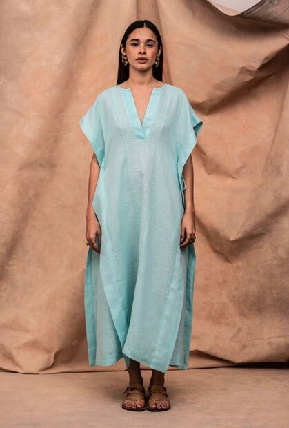 El vestido que nos muestra en su reel es de lino en color turquesa claro y es bellísimo, largo y amplio con corte rectangular y un escote en V. Presenta un bordado hecho a mano en forma de conchitas.