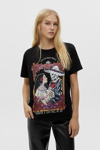 La colección de Pull and Bear contiene elementos gráficos en una amplia variedad de playeras donde predomina la esencia de este día con motivos muy mexicanos , además de ropa básica de la temporada como vestidos, chaquetas de cuero, tops con transparencias y chalecos en colores alusivos a la festividad, como lo son el negro, el blanco y el anaranjado.