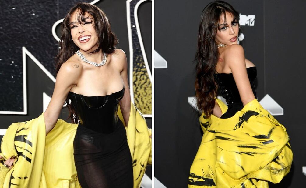 Danna posó en la alfombra roja de los MTV VMA 2024 con un fascinante total look negro con corset de látex y falda semitransparente con silueta columna y de cintura alta. Las transparencias se han ganado un lugar especial en las tendencias y siguen teniendo preferencia en diseños de gala.