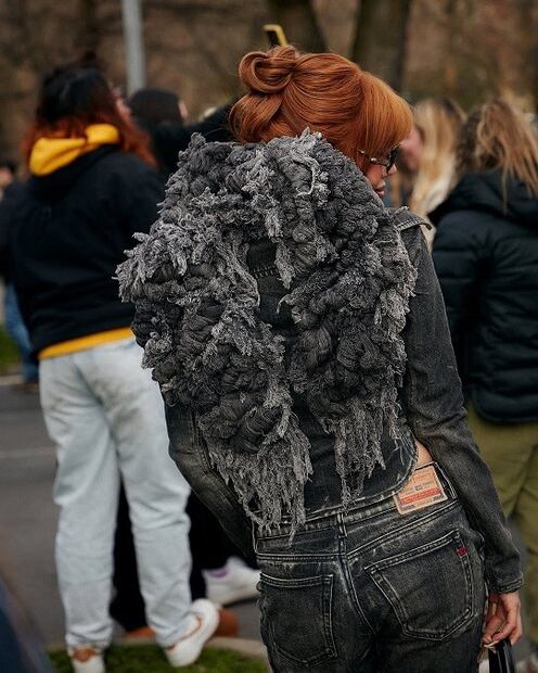 En el front row, Danna destaca con un look total denim de la firma en color oscuro. Luce unos jeans skinny de tiro medio, con efecto deslavado y franjas laterales. Completa el outfit con una chaqueta corta con solapa ancha, sobre la cual lleva una especie de estola en denim deshilachado que acomodó con forma de alas de ángel en la espalda.