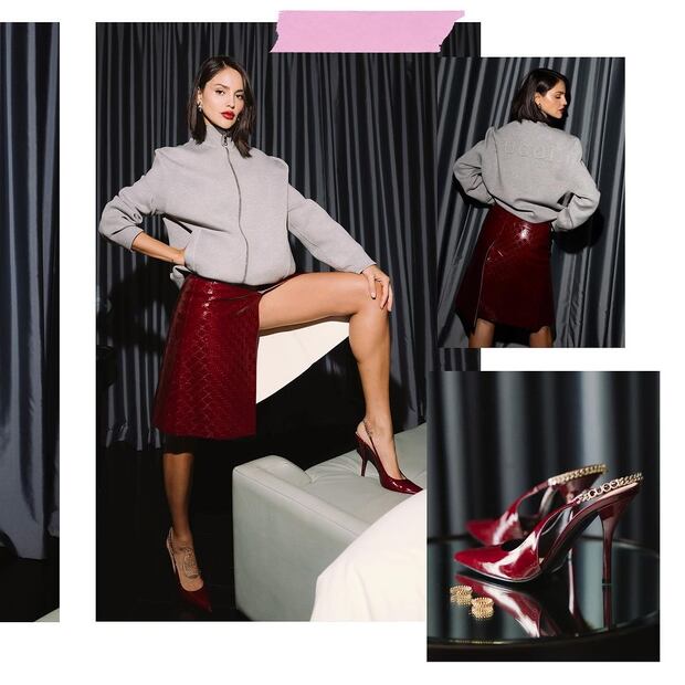 Eiza luce esta prenda de tinte deportivo con una sofisticada falda lápiz de abertura pronunciada en la parte delantera, es una pieza de la primera colección del actual director creativo de Gucci, Sabato de Sarno, para primavera/verano de 2024. En su diseño tiene las letras GG en relieve y el tono de la marca identificado como Rosso Ancora, que resalta en toda su propuesta para la temporada.