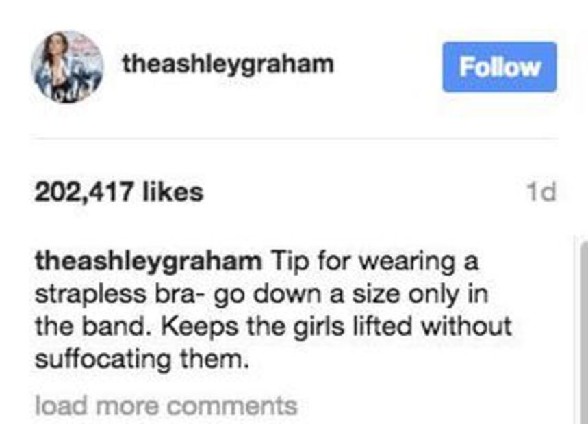 En el comentario, Ashley aconseja lo siguiente: “Consejo para usar un sostén sin tirantes: opta por ir una talla más abajo al contorno de la banda ajustadora. Mantiene a las 'chicas' arriba sin sofocarlas”. Es importante mencionar que se debe ir una talla más abajo solo en la banda sujetadora mas no en la copa.