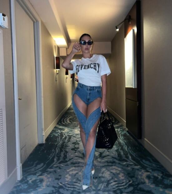 En la foto se puede ver a Georgina usando unos jeans de mezclilla con varios cortes grandes pero estilizados en sus piernas. Los primeros a la altura de sus caderas y entrepierna, mientras que los otros comenzaban ligeramente arriba de las rodillas y hasta debajo de sus pantorrillas.